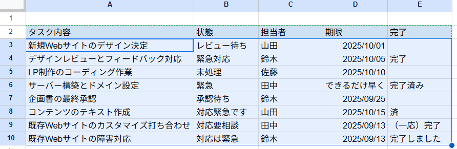 「完了」「未処理」「緊急」などのキーワードに合わせて行を色分けすれば、タスク管理や進捗管理がぐっと効率的になり、ひと目で状況を把握できるようになります。