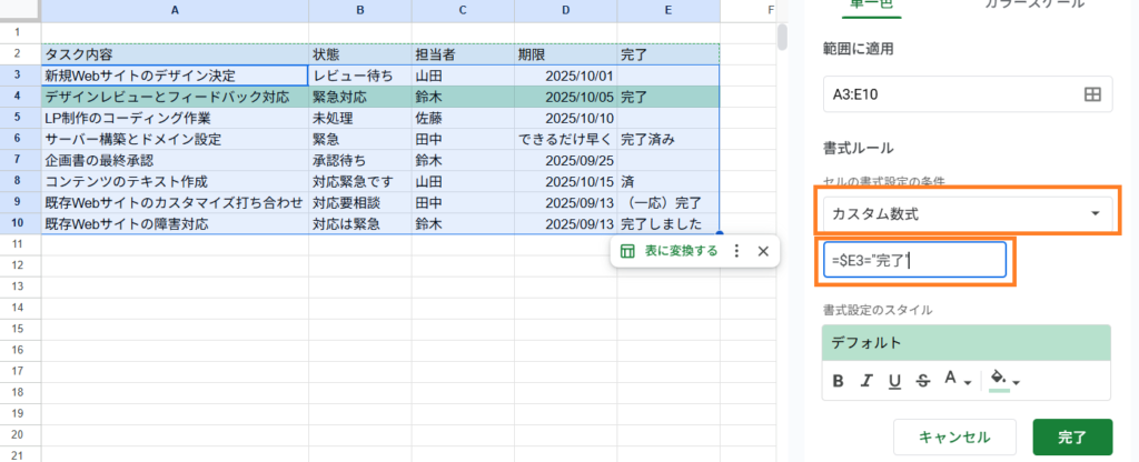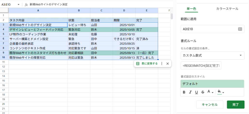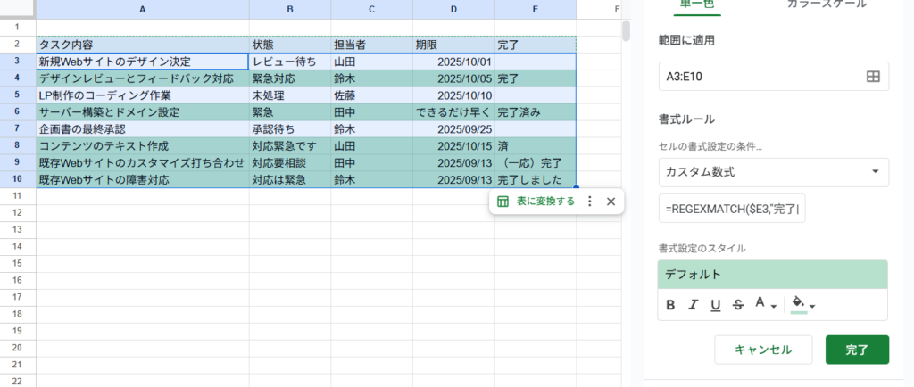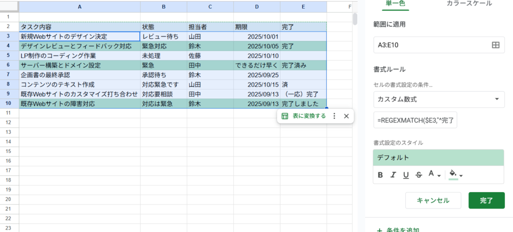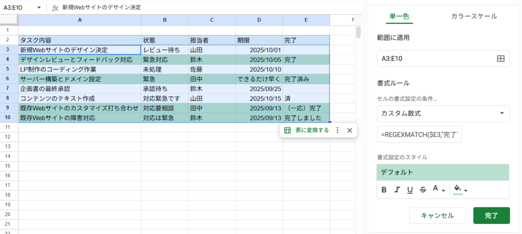 E列に「完了」という文字を含む(部分一致)場合に、その行全体を色付けしたいときは次の数式を入力します。