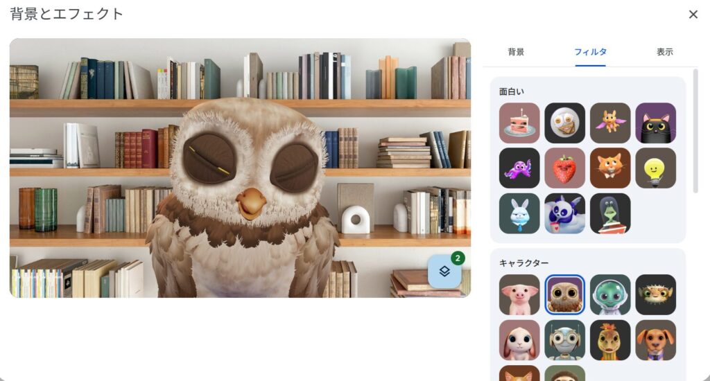 設定が完了したら、右上の閉じる【×】をクリックする。【参加をリクエスト】をクリックして、GoogleMeetに参加すると設定されたフィルタで適用されている。
