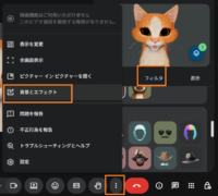 1)画面下にある【縦3つの点(その他のオプション)】を選択し、【背景とエフェクト】を選択する。背景の変更は【背景】タブ、フィルタの変更は【フィルタ】タブで行える。アバター化しても背景は変更できる。